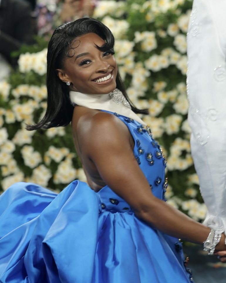 Gymnastics legend Simone Biles glowed in a playful blue mini dress with a sweeping train and crisp white collar, topped off with sky-high heels.