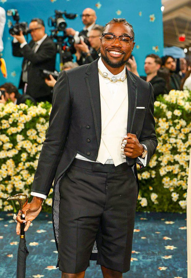 Olympic 100m champion Noah Lyles arrived in a tailored black suit, paired unexpectedly with shorts, tall socks, and a statement cane.