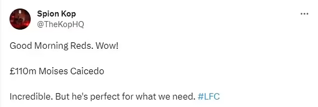 Another response from a Liverpool fan, “Good Morning Reds. Wow! £110m Moises Caicedo Incredible. But he's perfect for what we need.”