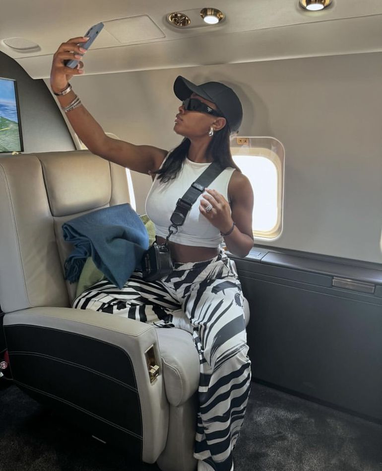 In captivating photo from her recent trips, Tolami is seen aboard a private jet, sparking speculation about a luxurious getaway possibly with her footballer boyfriend.