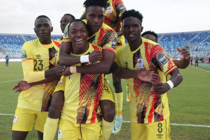 Uganda Hippos players join Isma Mugulusi (C) in celebrating his opener against Central African Republic at the 2023 U20 AFCON | Credit FUFA Media