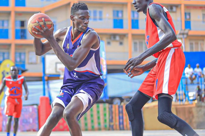 Joel Kayiira( blue) takes on Joseph Kumbai in the league game played on Sunday| NBL image