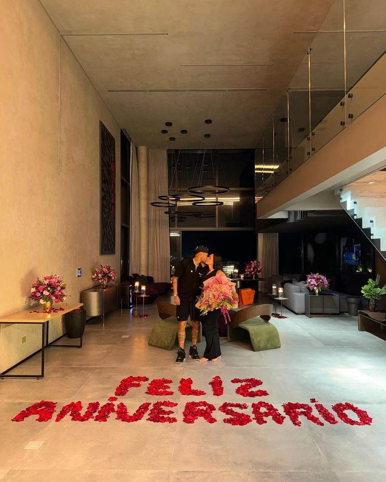 The celebration featured a stunning setup with rose petals meticulously arranged on the floor to spell out "FELIZ ANIVERSARIO" (Happy Anniversary in Portuguese).