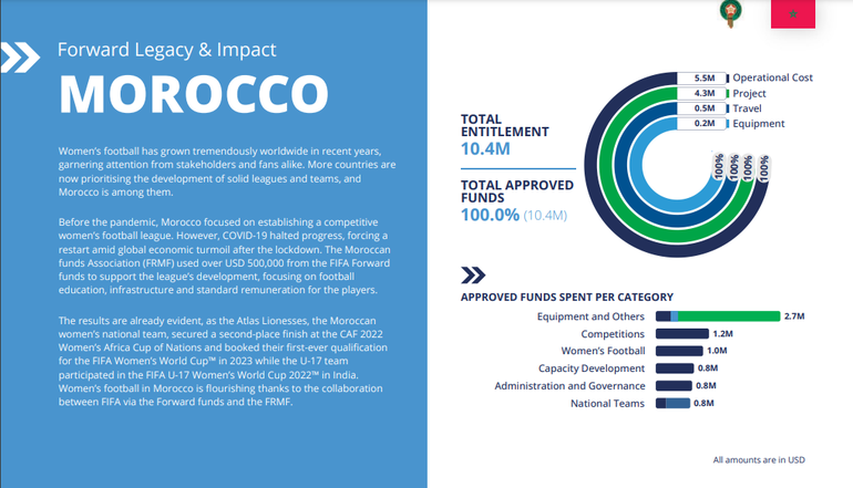 Africa-wide, FIFA approved funds in both those areas came out to $29.3 million and $49.5 million respectively; Morocco took the lead with $1 million spent on operational expenses for women’s football and $1.2 million sunk into competitions (specifically the establishment of a “competitive women’s football league”, with emphasis on “football education, infrastructure and standard remuneration for the players.”)