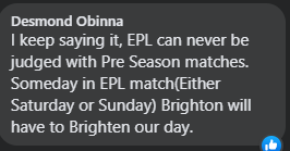 “I keep saying it, EPL can never be judged with Pre Season matches. Someday in EPL match(Either Saturday or Sunday) Brighton will have to Brighten our day,” Desmond concludes.