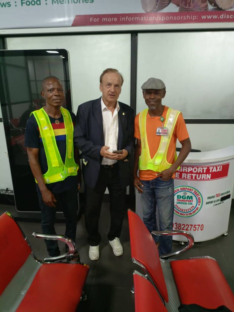 The experienced German manager known for his calm demeanor, was seen wearing his signature suit as he arrived in Uyo on Thursday.