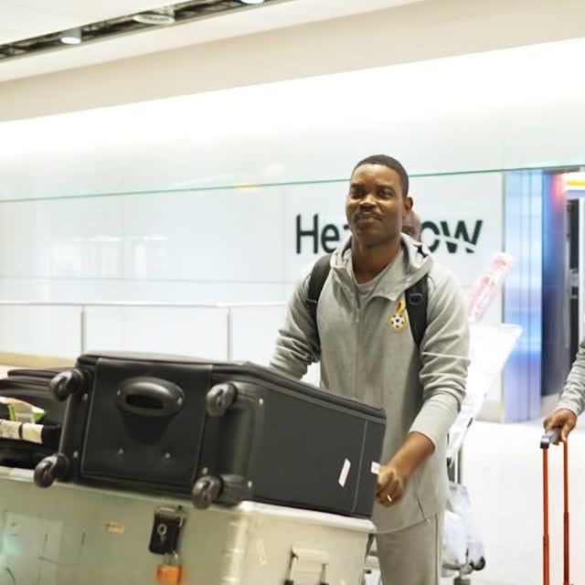 The arrival of the Black Stars was captured in a series of moments, from navigating the bustling terminals of Heathrow to boarding their transport.