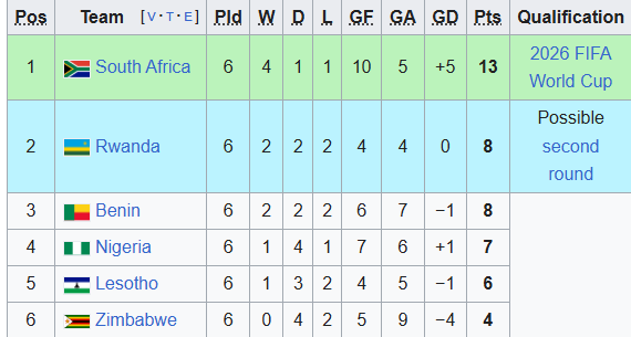 Nigeria are still behind South Africa, Benin Republic, Rwanda, and potentially Lesotho, should they receive the three points at Bafana Bafana’s expense.