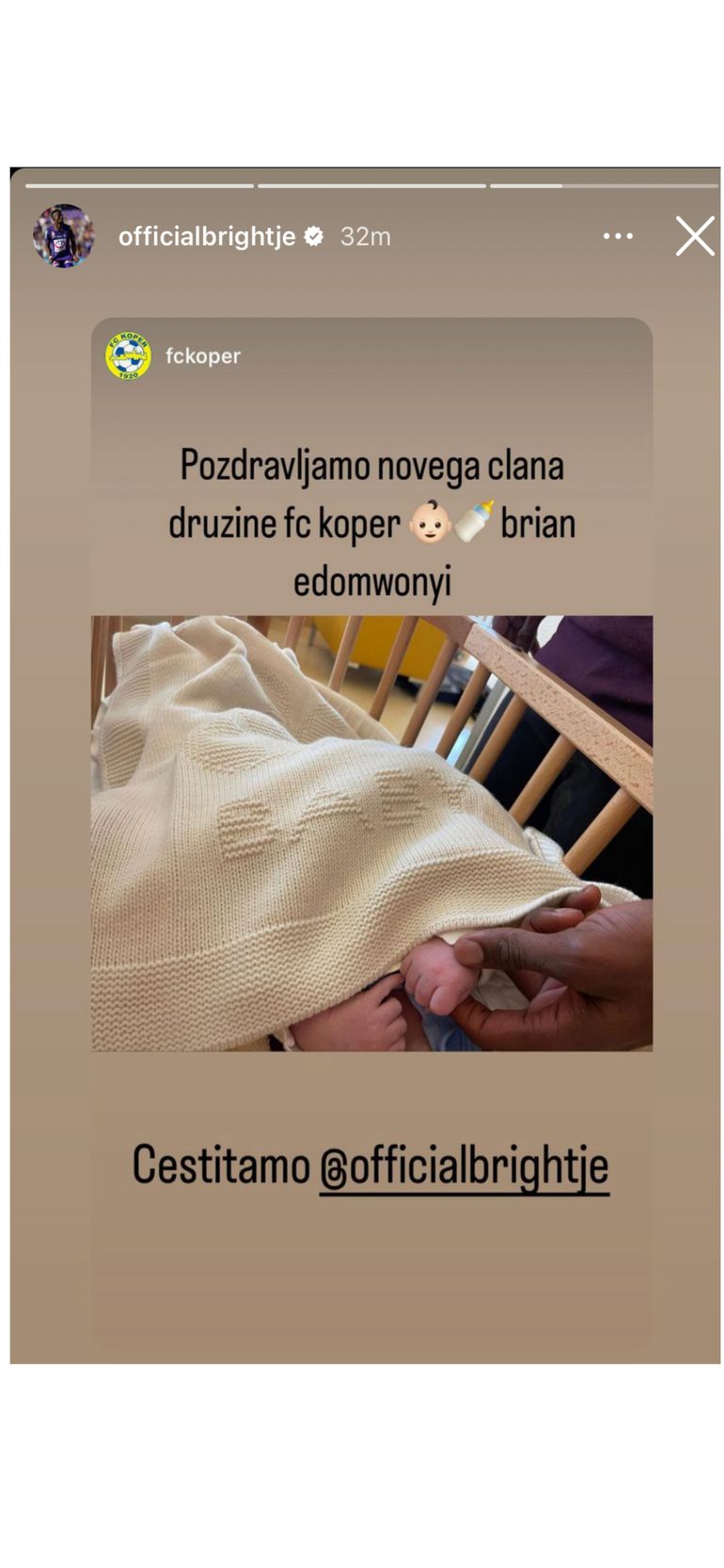 The 28-year-old Koper FC forward took to his official Instagram story to announce the birth of his first son Brian Efosa Edomwonyi on Friday, posting a photo of his new-born baby’s hand while wrapped in cream-coloured crotchet blanket.