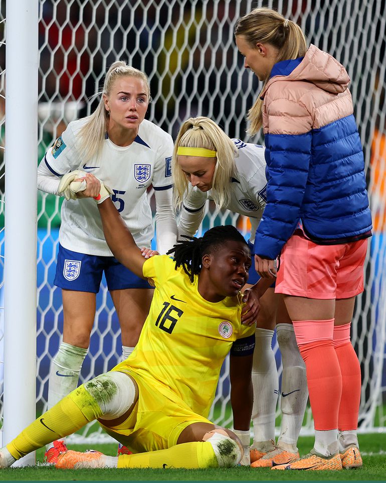 After England’s victory was confirmed, Kelly walked up to a tearful Nnadozie to console her and stopped the FIFAWWC cameraman who tried to film the emotional moment captured by X.com user, Charlotte Patterson.