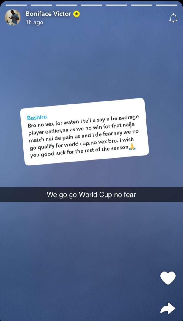 "Na as we no win for that Naija match nai dey pain us, and I dey fear say we no go qualify for World Cup. No vex, bro. I wish you good luck for the rest of the season.’