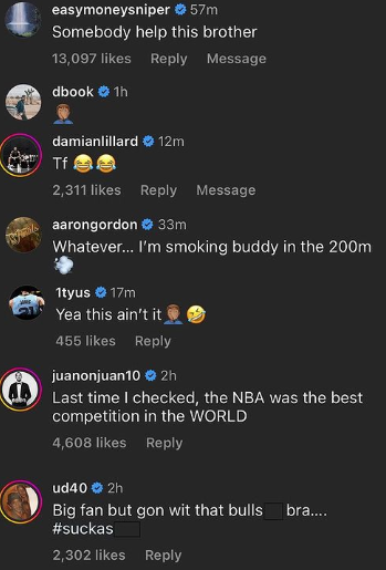 Durant in the comments said, "Somebody help this brother while his Phoenix Suns teammate Devin Booker left a face-palm emoji.