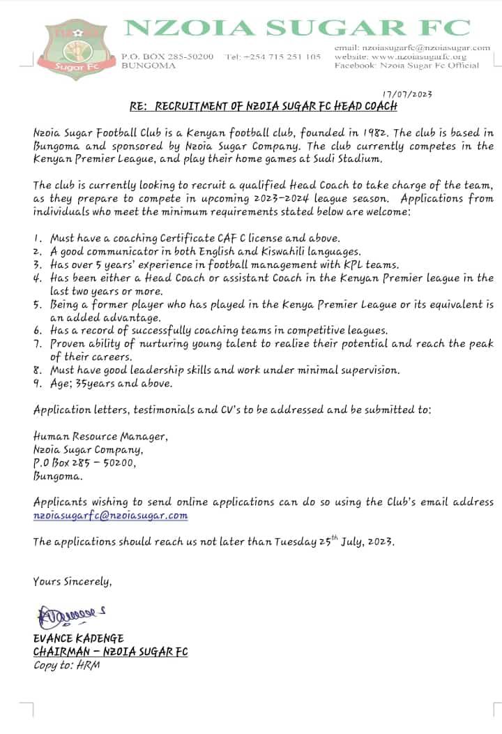 Interested applicants have been advised to send their application letters, testimonials, and CVs to the club’s email address here or send them via the Nzoia Sugar Company postal address, 285-50200, Bungoma.