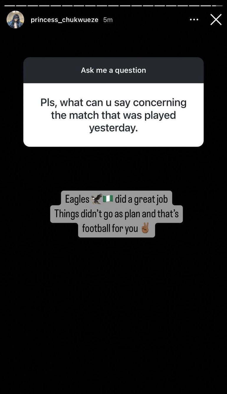 In another response, she shared her own perspective on the Super Eagles' overall performance, acknowledging the team's efforts while recognizing the unpredictable nature of football.
