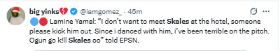 Another added, “Yamal hasn’t been the same since that dance with Skales,”