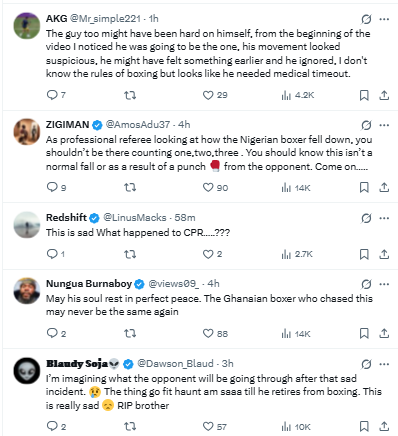 Other Nigerians echoed similar sentiments, a fan said, posting, “A Nigerian boxer sadly passed away during a match against a Ghanaian opponent at the Bukom Boxing Arena last night. RIP champ.
