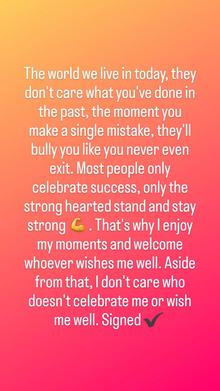 She posted a detailed message on her Instagram stories about celebration and bullying.