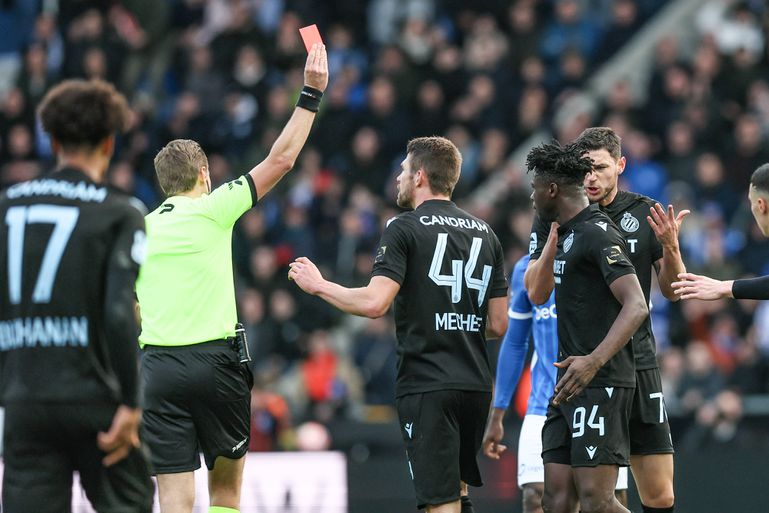 Club s Abakar Sylla receives a red card from the referee during a soccer match between KRC Genk and Club Brugge, Sunday 08 January 2023 in Genk