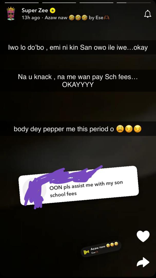 She then added: “Na u knack, na me wan pay Sch fees...OKAYYYY. Body dey pepper me this period o.”