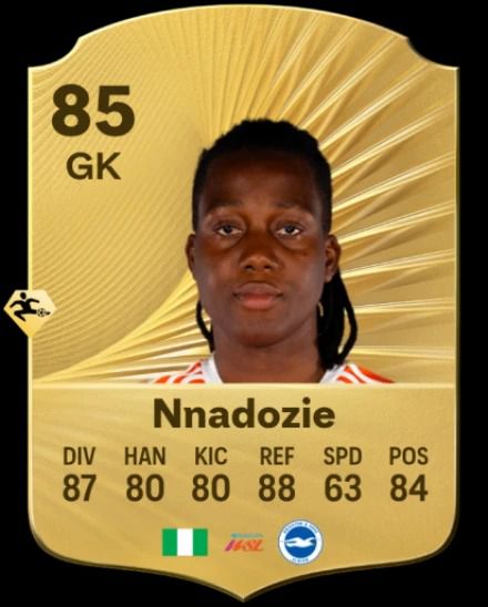 Super Falcons goalkeeper Chiamaka Nnadozie is ranked 106th, also boasting an 85 overall rating. The Paris FC shot-stopper's stats include 80 pace, 78 shooting, 80 passing, 88 dribbling, 63 defending and 84 physicality, affirming her position as one of the top goalkeepers in the women's game.