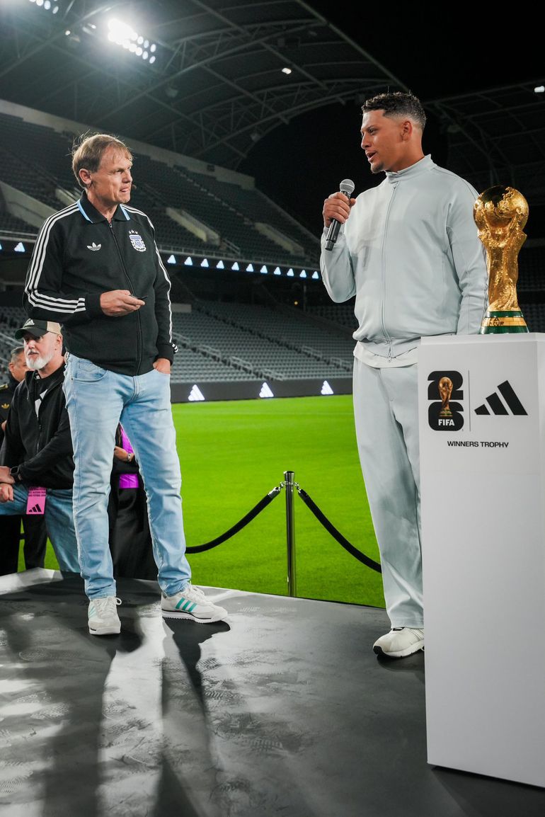 Patrick Mahomes teams up with Lionel Messi as the superstars pose with the FIFA World Cup trophy.