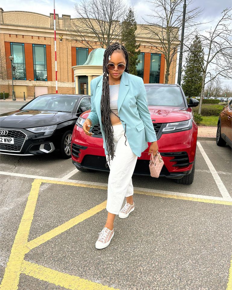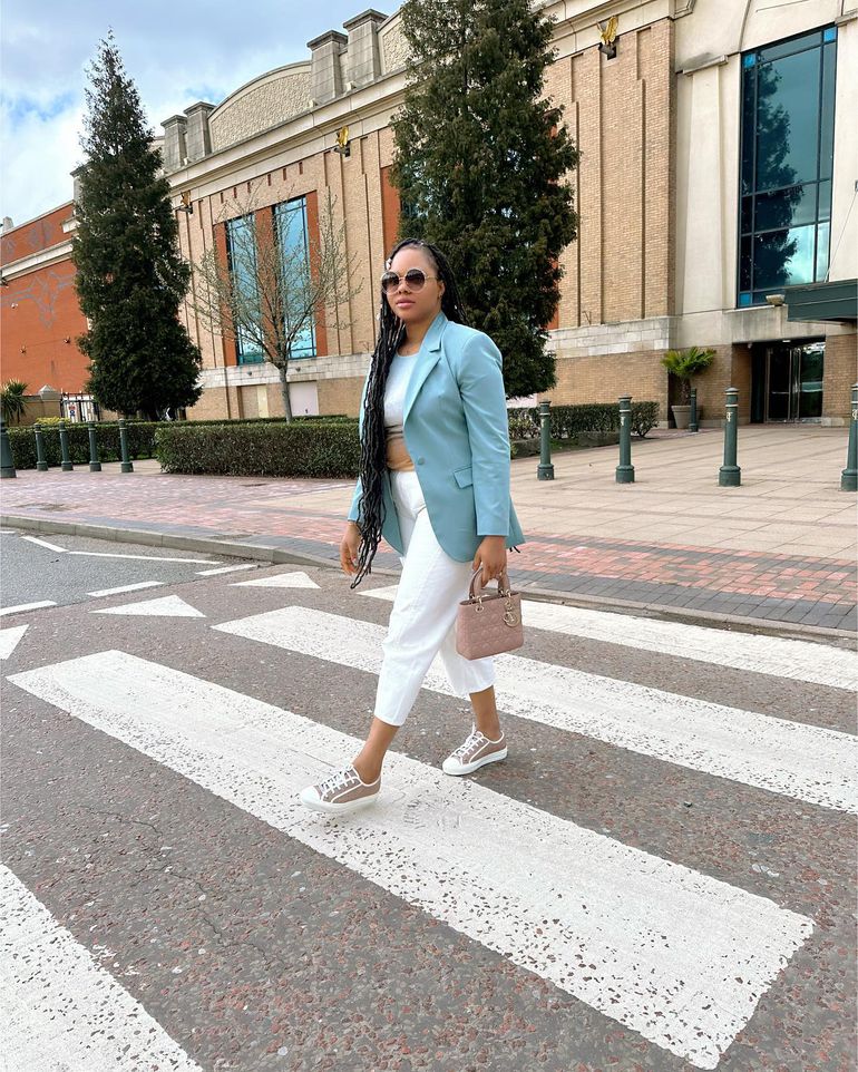 The photos featured her on lengthy braids rocking a mint green long-sleeved blazer on a shirt, and high waist straight pants while wearing a Walk'n'Dior Sneaker.