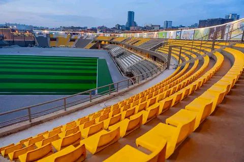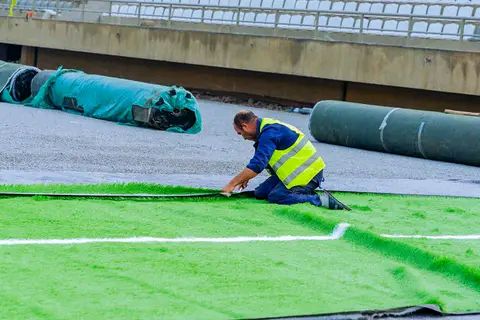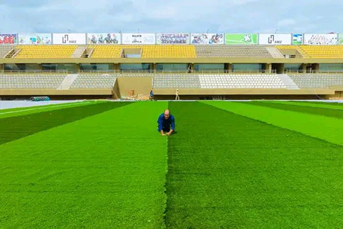 The stadium has now received a playing surface; an artificial turf that has been fully laid, ready for action.