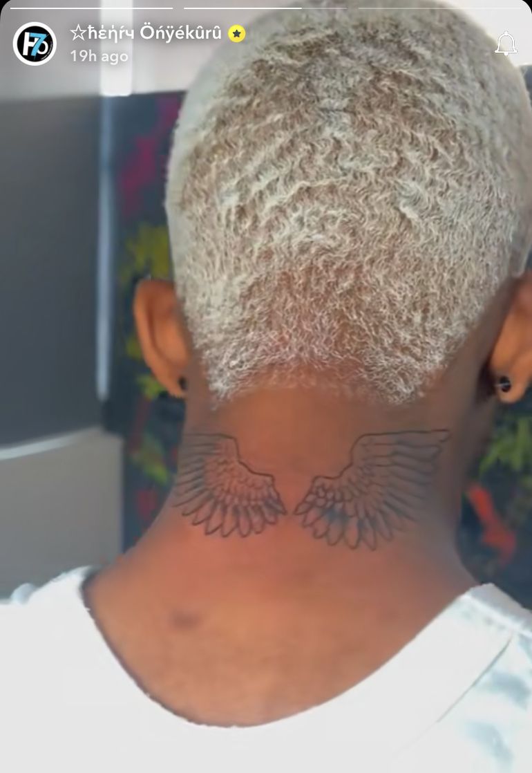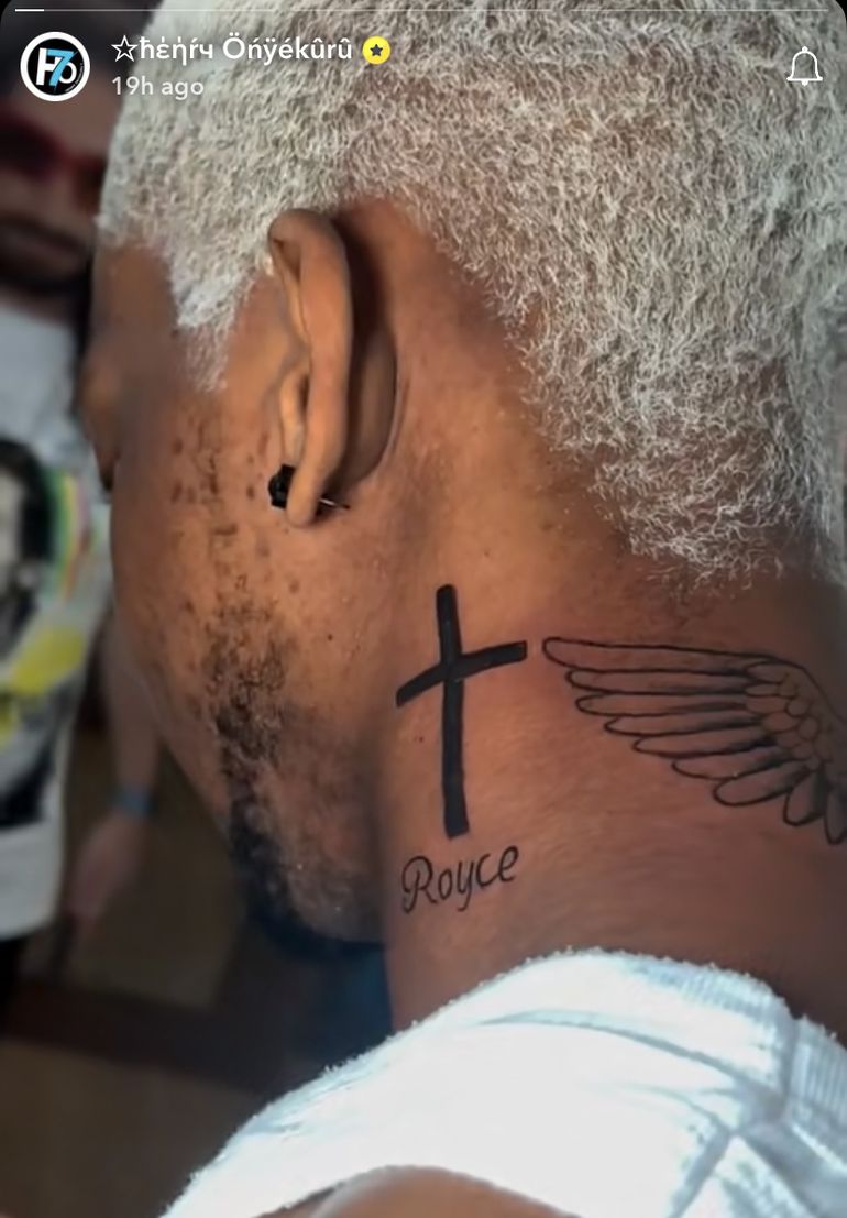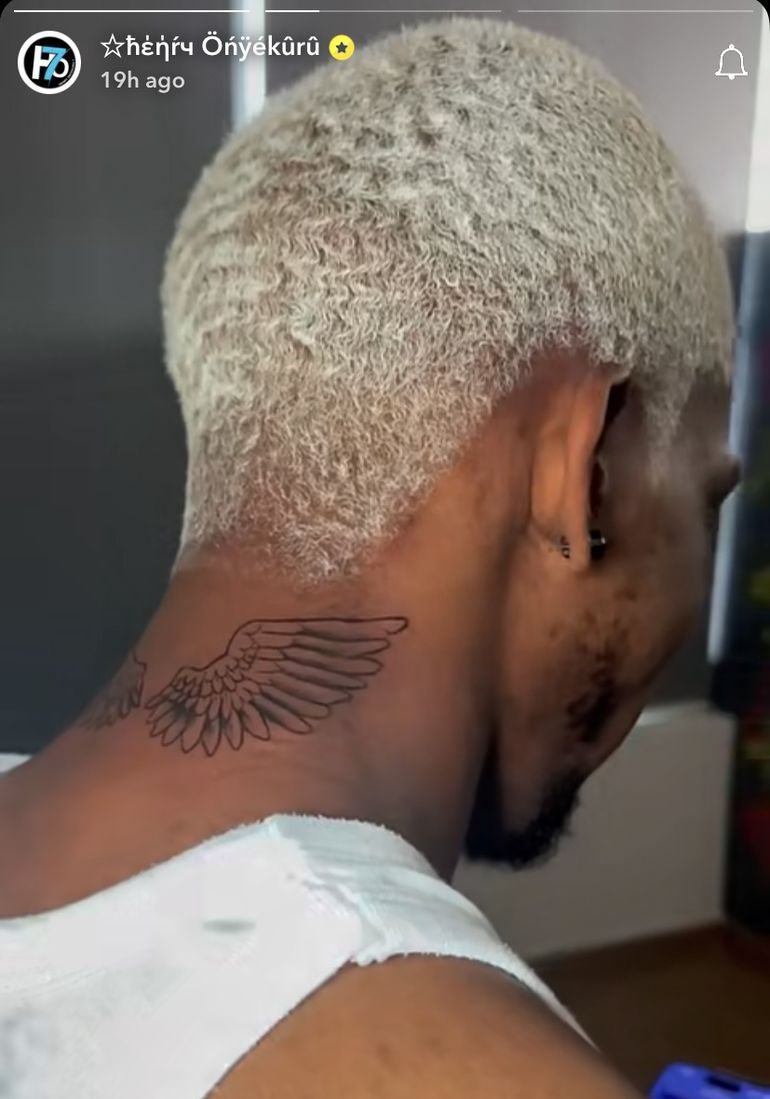 Onyekuru, the most followed Nigerian footballer on Instagram, got a Crucifix tattoo adorning the side of his neck symbolizing his faith and spirituality, alongside tattoo of Angel wings on his napes.