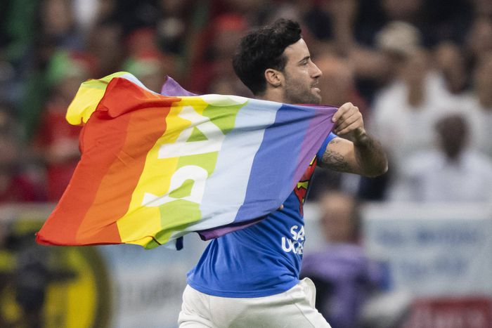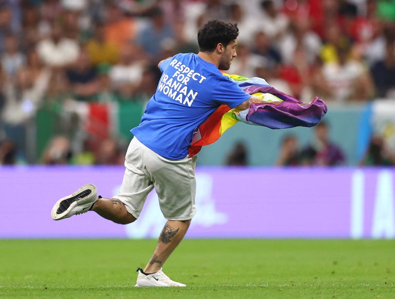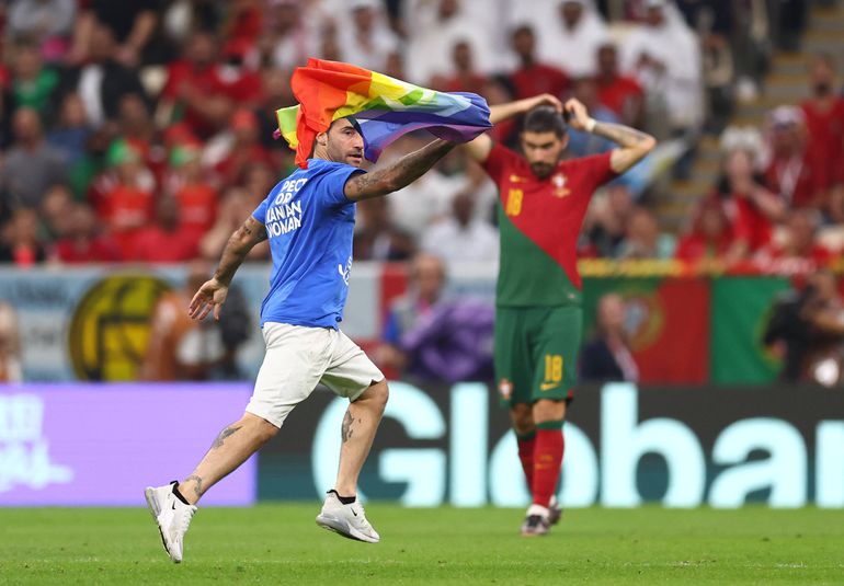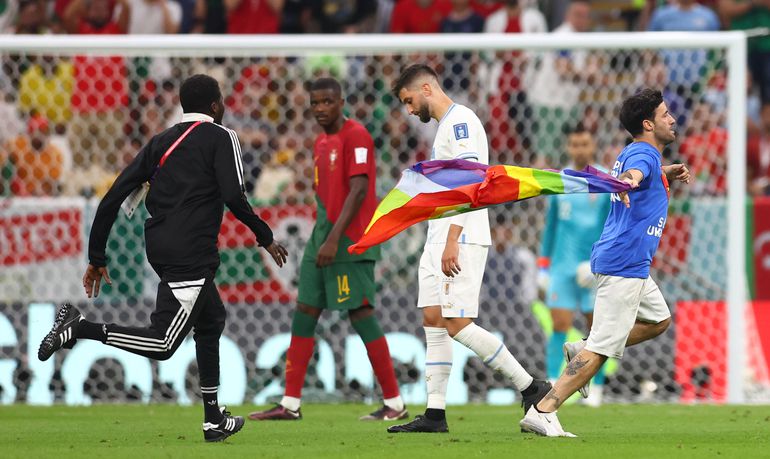 Pitch invader displays rainbow flag during the Portugal vs Uruguay match