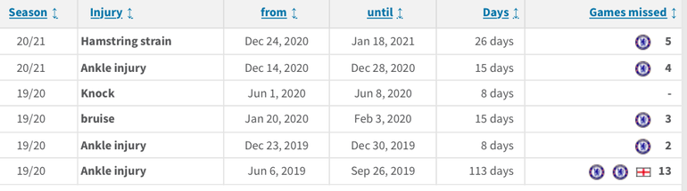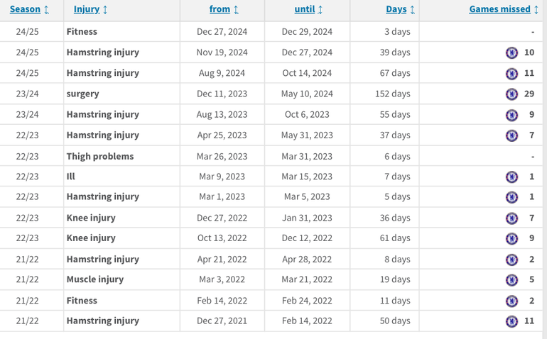 Hamstring injuries have been a recurring issue for Reece James, while he has previously dealt with ankle and knee issues.