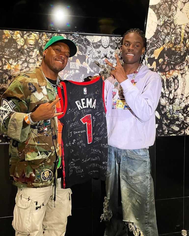 Toronto DJ, producer, and recording artist 4Korner presented Rema with a Raptors jersey.