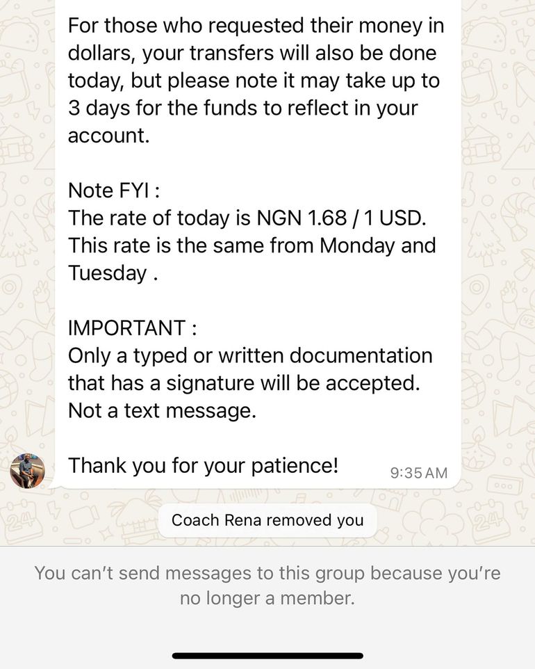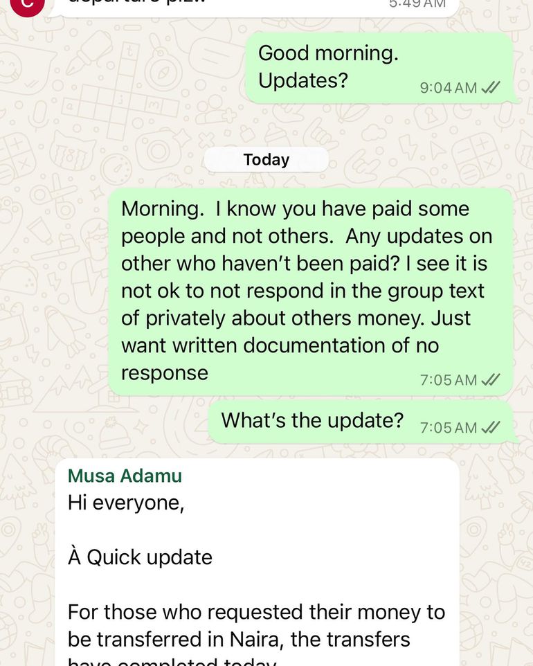 She said, "Asking for updates for over two weeks about payment of Allowances and being Ignored privately and in the group text….