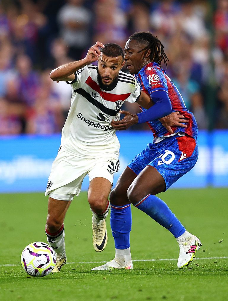 Noussair Mazraoui in action against Eberechi Eze of Crystal Palace