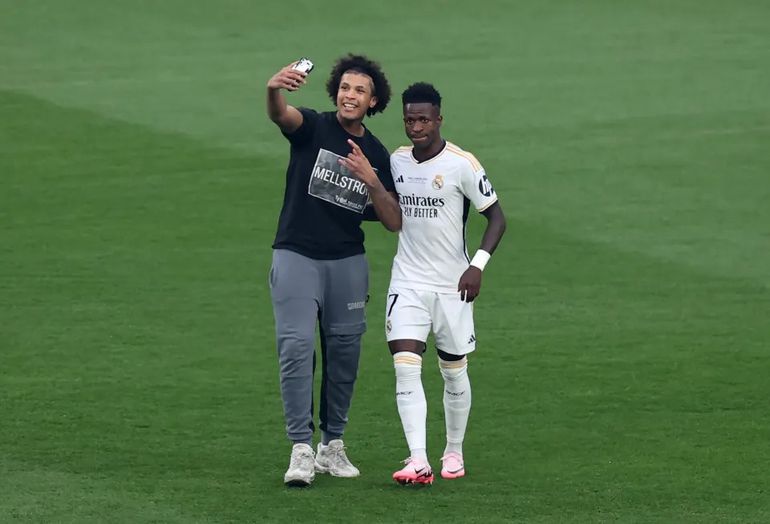 One of the pitch invaders on the field stopped to snap a selfie with Real Madrid player Vinicius Junior.