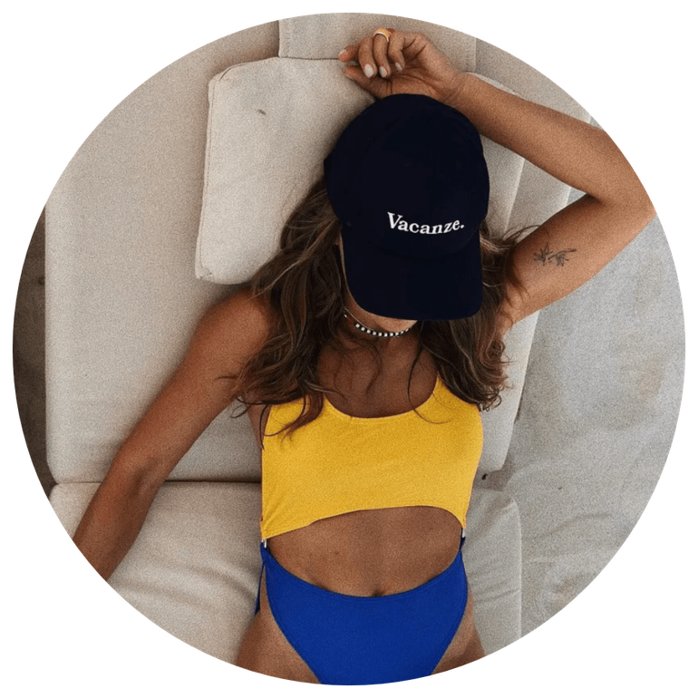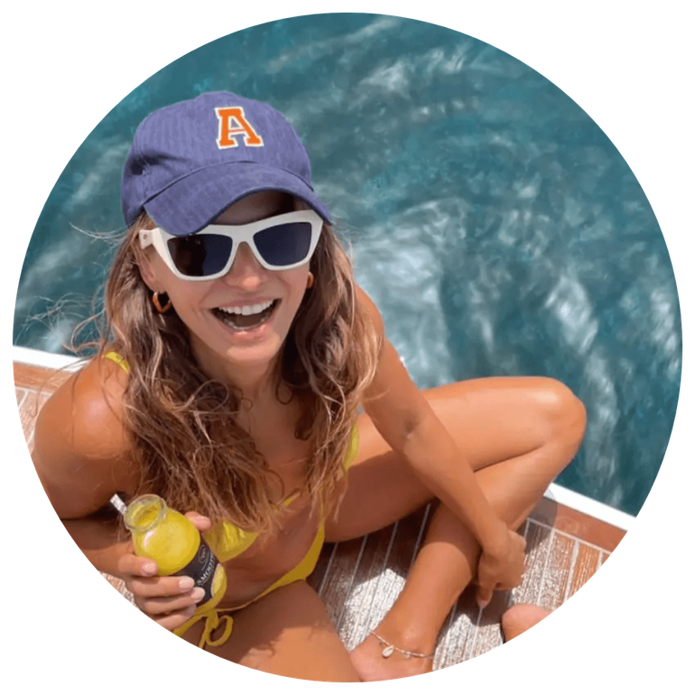 Anna advertised her range of sunscreen goods while sporting a yellow bikini top and blue bottoms, a black hat, and sunglasses.