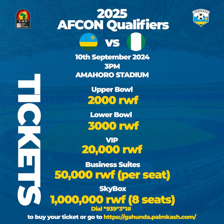 The least expensive tickets for fans will be sold for 3000 RWF (₦3,705) and 2000 RWF (₦ 2,470), respectively, based on the current foreign currency exchange rate found on Google. The price of a VIP ticket is 20,000 RWF (about ₦24,701).