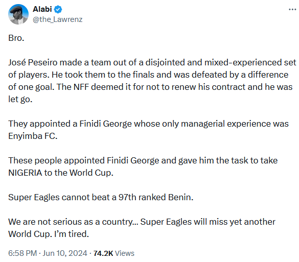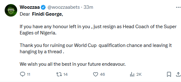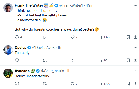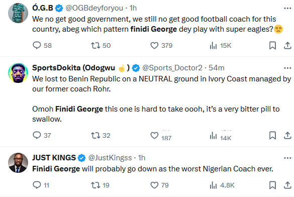 Social media platforms Facebook and X have been flooded with messages of fans calling for the sack of Finidi George.