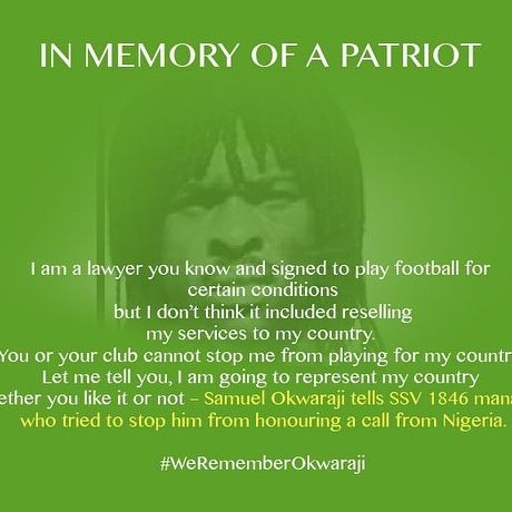 "Sam displayed high patriotism while playing for Nigeria, an example that is still relevant in Nigeria today: #WeRememberOkwaraji."