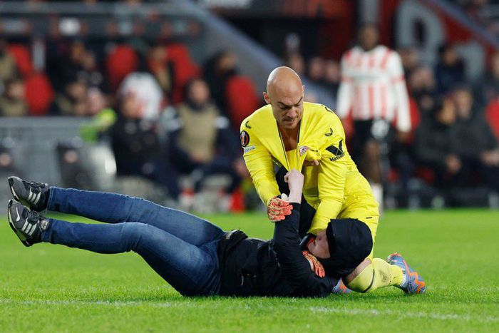 A pitch invader ran straight to Sevilla goalkeeper Marko Dmitrovic at the end of the Europa League game between PSV and Sevilla, but was pinned down in MMA style by the goalkeeper.
