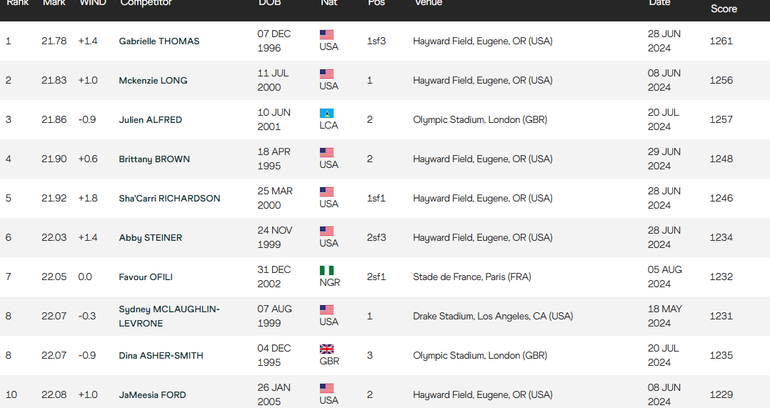 Others to complete the Top 10 are: Abby Steiner (6th - 22.03s), Favour Ofili (7th - 22.05s), McLaughlin-Levrone (8th - 22.07s), Asher-Smith (8th - 22.07s) and JaMeesia Ford (10th - 22.08s).