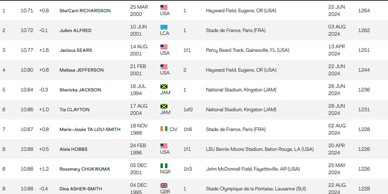 Others to complete the Top 10 are: Tia Clayton (6th - 10.86s), Marie Josee Ta Lou-Smith (7th - 10.87s), Aleia Hobbs (8th - 10.88s), Rosemary Chukwuma (8th - 10.88s), and Dina Asher-Smith (8th - 10.88s).