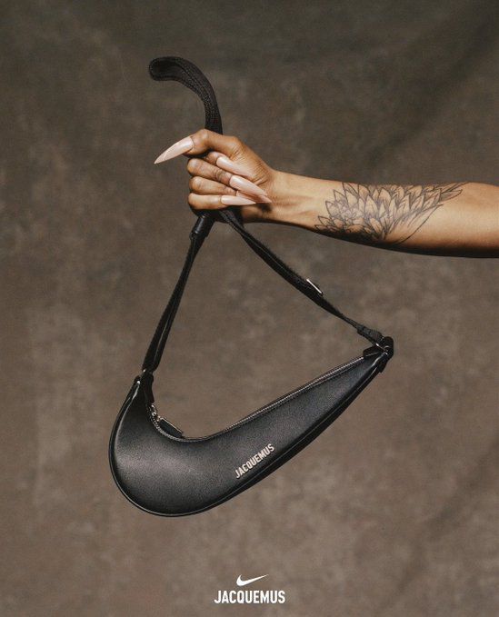 The dinky leather Swoosh bag is a chic joint wardrobe that takes its silhouette from the shape of Nike's 54-year-old iconography, highlighted with Jacquemus' signature hardware logo and a wide adjustable shoulder strap.
