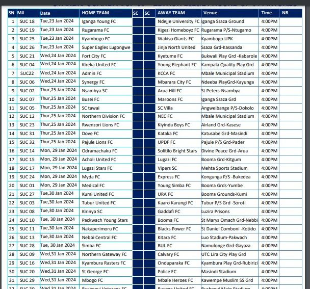 KCCA will be away to Admin on January 24 at the Mbale Municipal Stadium, while Express will visit Myda at Kongunga Primary School, Bukedea on January 29.