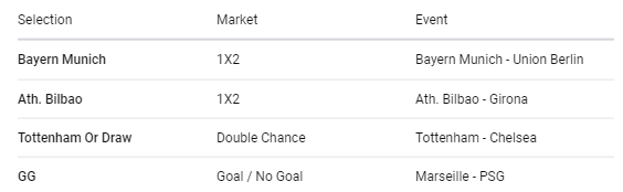 Our tickets today include Marseille, Tottenham, Bayern Munich and Athletic Bilbao respectively.