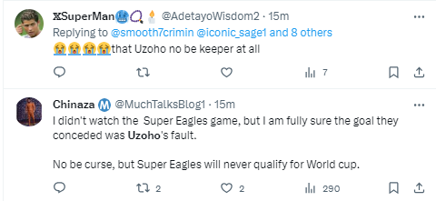 Goalkeeper Francis Uzoho was blamed for his role as the Super Eagles drew against Lesotho and now some fans believe he is at fault for the goal against Zimbabwe.