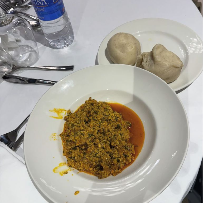 He posted photos of his arrival along with a meal of fufu and egusi.