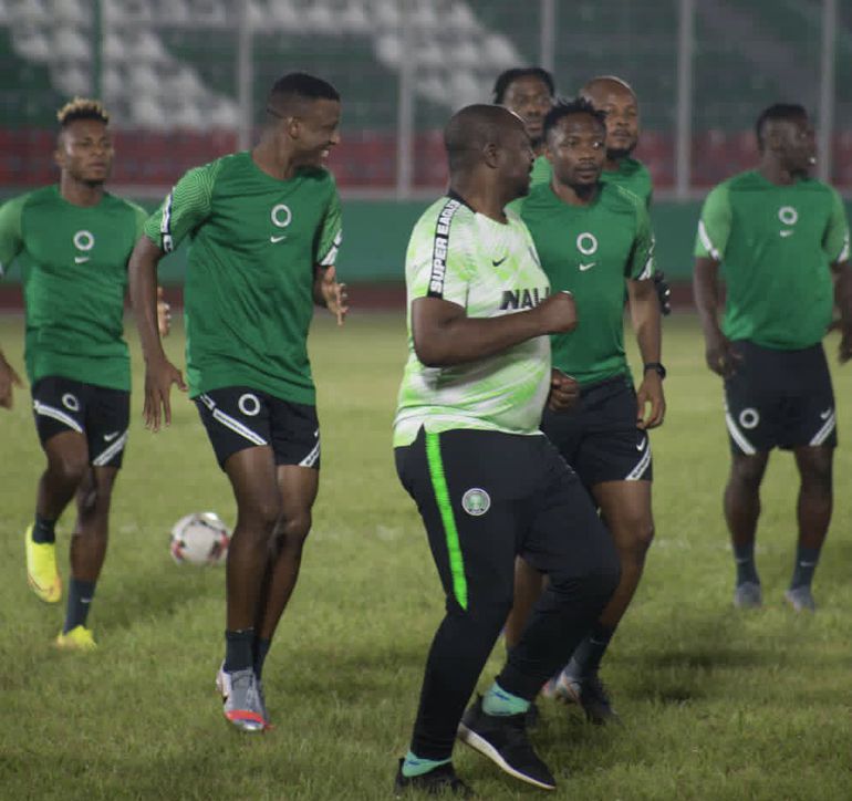 Minister of Sports, Dare, in the company of then NFF President, Amaju Pinnick, joined the Super Eagles in training at the Samuel Ogbemudia Stadium in Benin.
