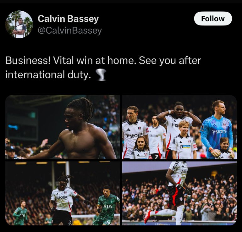 Super Eagles star Calvin Bassey has sent an emotional message to fans after his team's thrilling win over Tottenham in the London derby on Sunday.