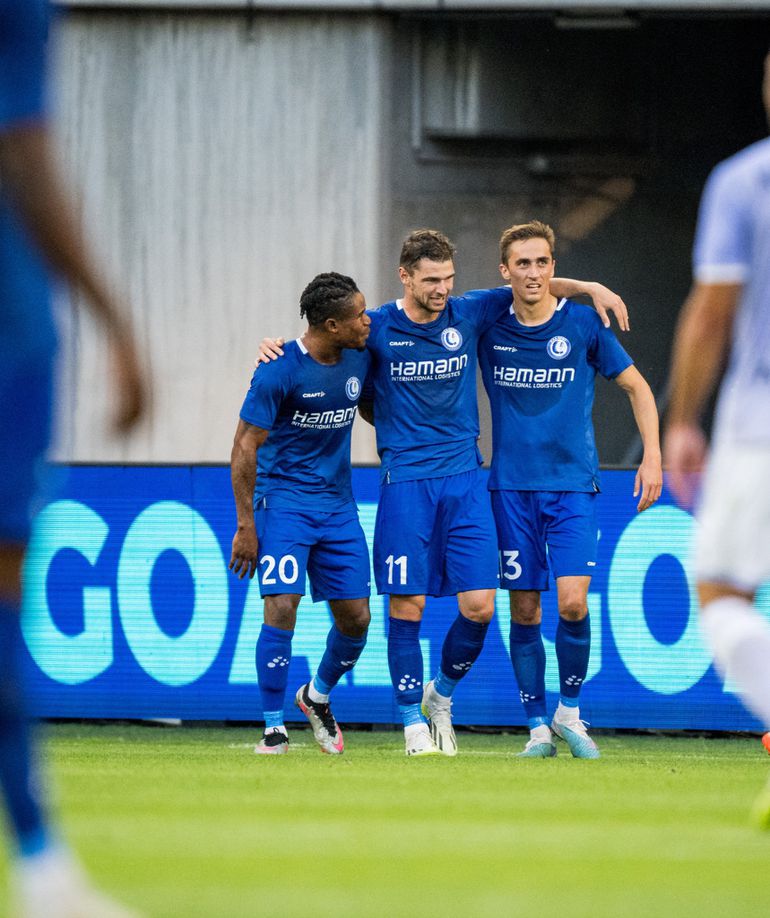 Gift Orban and Hugo Cuypers celebrate against Pogno. (Photo Credit: Gent/X)