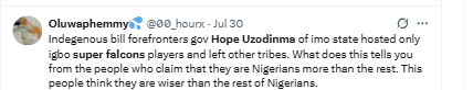 However, Uzodimma has suffered criticism from fans for only hosting Igbo players in the Super Falcons, with social media commentators like VeryDarkMan calling out the governor for what they perceive as regional favoritism.